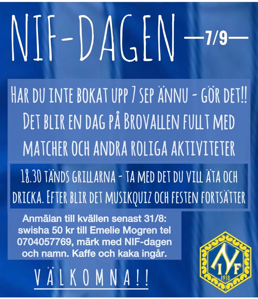 Boka upp lördag den 7 september. Det blir en dag fullt med aktiviteter, matcher och annat roligt denna dag, 18:30 kommer grillarna att tändas, så ta med det Ni vill äta och dricka. Sedan blir det musikquiz och festen fortsätter. Anmälan till kvällen senast 31/8: Swisha 50 kr till Emelie Mogren (070-4057769) märk med NIF dagen och Ert namn. Kaffe och kaka ingår! Hela schemat för dagen kommer ut här och övriga sociala medier inom kort.