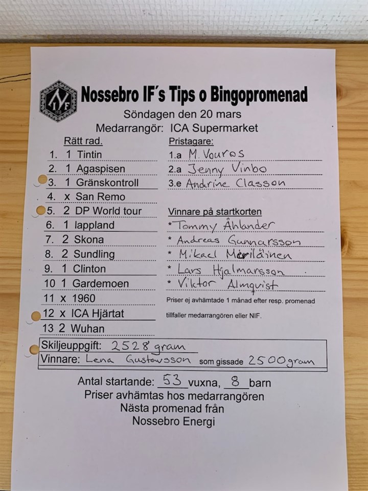 61 personer gick vårens första Tipspromenad i söndags från ICA Supermarket! Se rätta raden och vinnarna här Se hela vårens program här Nossebro IF 21 mar 2022 0kommentarer