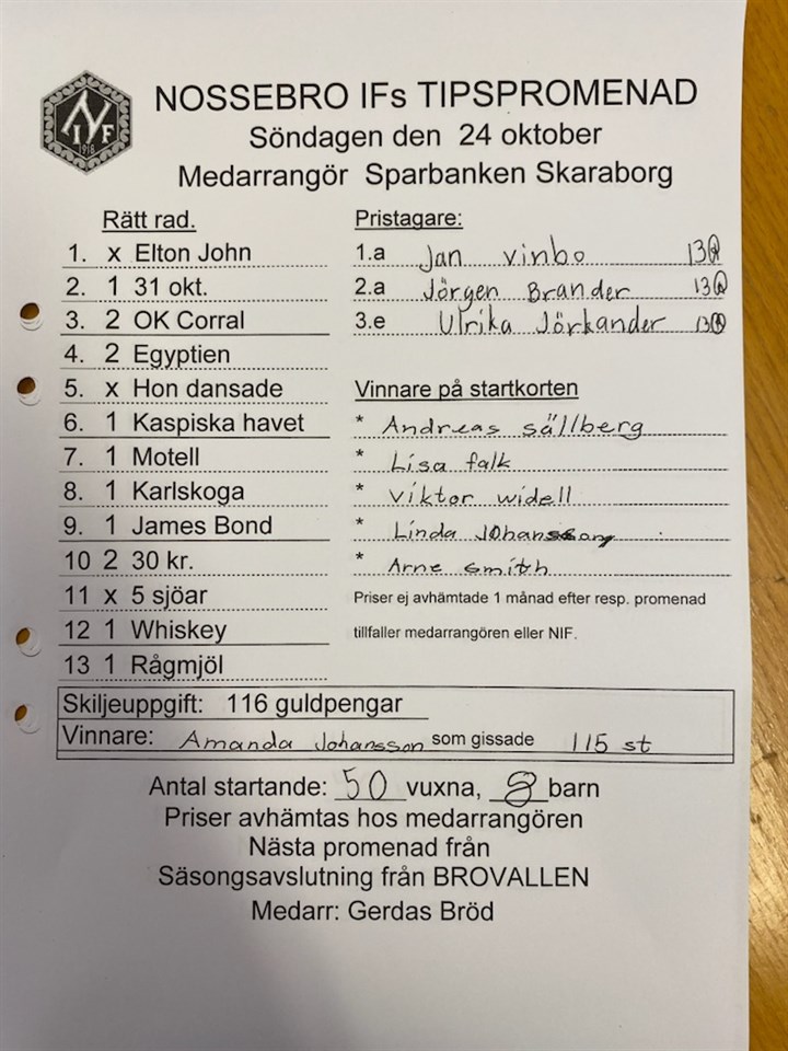 53 personer gick söndagens Tips- & Bingopromenad från Brovallen med NLT som medarrangör. Se rätta raden och vinnarna här Se bild från Tipspromenaden här