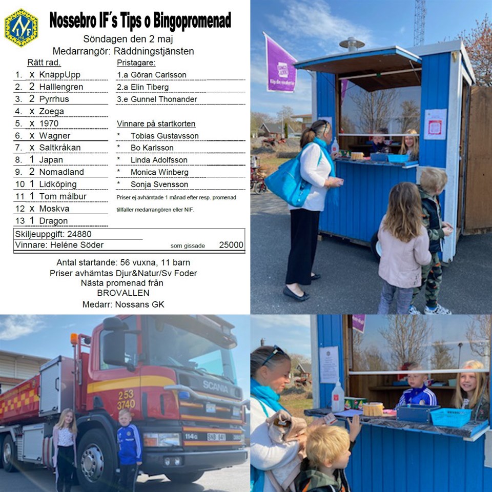 67 personer gick söndagens Tips- & Bingopromenad från Räddningstjänsten i Nossebro! Se rätta raden och vinnarna här! Se bilder här! Nossebro IF 3 maj 2021 0kommentarer