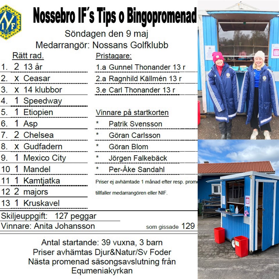 42 personer gick söndagens Tips- & Bingopromenad från Brovallen i samarbete med Nossans GK. Se rätta raden och vinnarna här! Se bild här Nossebro IF 10 maj 2021 0kommentarer