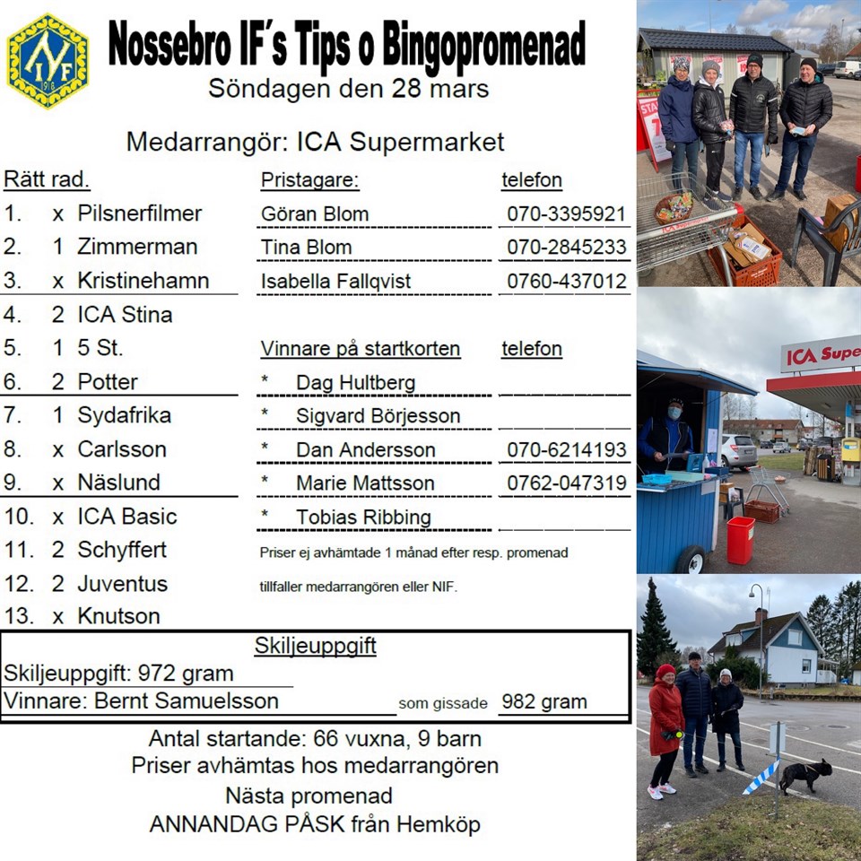 75 personer gick söndagens Tips & Bingopromenad från ICA Supermarket Nossebro. Se rätta raden och vinnarna här Se bilder från Tipspromenaden här Nossebro IF 29 mar 2021 0kommentarer