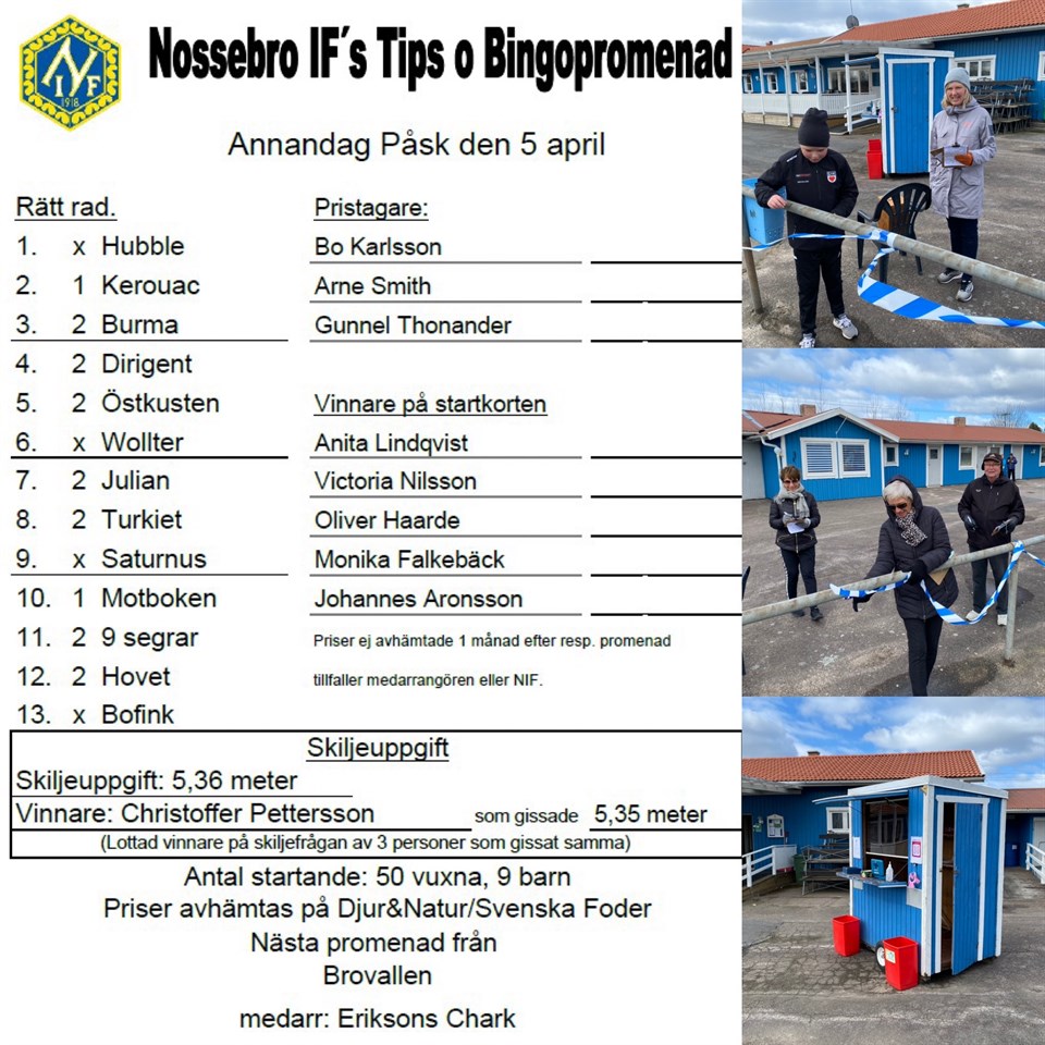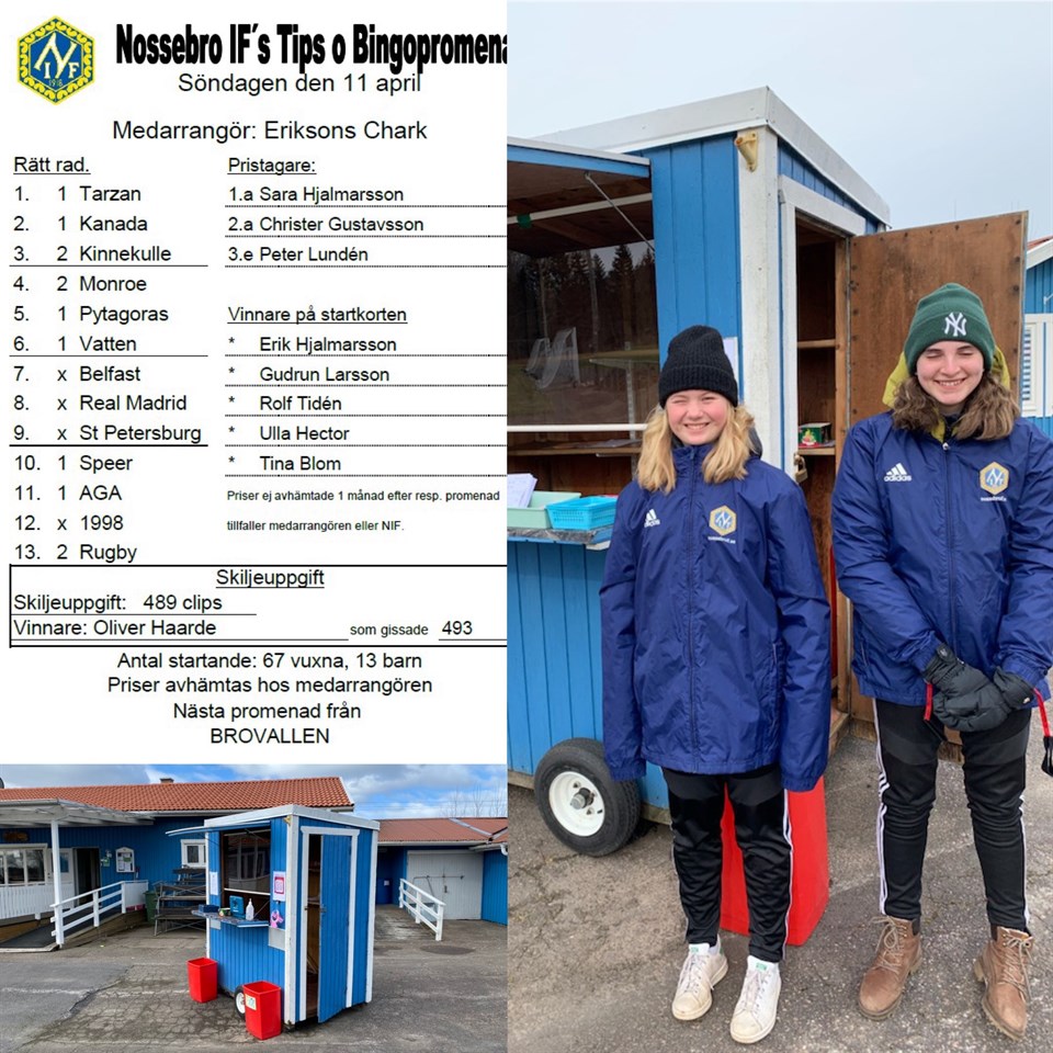 80 personer gick söndagens TIps- & Bingopromenad från Brovallen med Eriksons Chark som medarrangör. Se rätta raden och vinnarna här Se bild från Tipspromenaden här Nossebro IF 12 apr 2021 0kommentarer