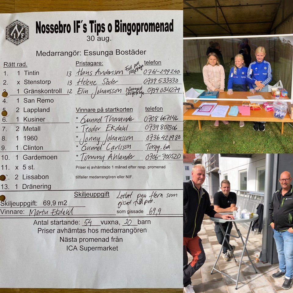 74 personer gick söndagens Tips- & Bingopromenad från Nya Gullregnet, Torggatan 8 med Essunga Bostäder som medarrangör. På bilderna syns Anna, Astrid och Ines från NIF som sålde Tips och Bingo-kuponger samt Mikael, Henric och Peter från Essunga Bostäder som visade de nyrenoverade lägenheterna i Nya Gullregnet! Se rätta raden och vinnarna här Se bilderna från promenaden här Nossebro IF 30 aug 2020 0kommentarer