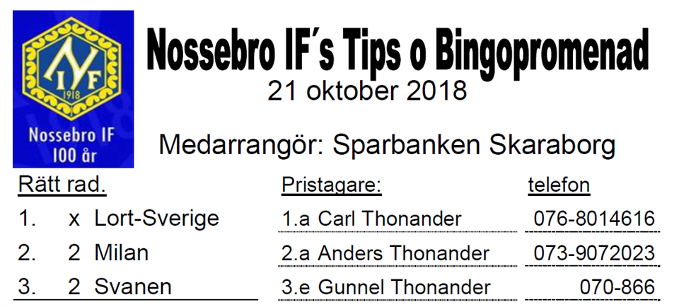 1:a pris: Kenneth Dahlberg, Grästorp, 17 rätt, Vinst: 3 100 kr. 2:a pris: Erik Hjalmarsson, Nossebro, 16 rätt (51 mål*), Vinst: 1 860 kr. 3:e pris: Sara Hjalmarsson, Alingsås, 16 rätt (58 mål*), Vinst: 1 240 kr. Vinnarna underrättas personligen. *Rätt svar skiljefråga: NIF herr A gjorde 43 mål i serien. Omg Resultat 1 2 2 2 3 1 4 1 5 2 6 1 7 2 8 2 9 1 10 1 11 1 12 1 13 2 14 1 15 1 16 x 17 1 18 2 19 1 20 1 21 2 22 2