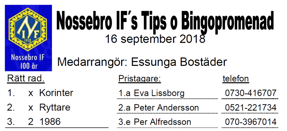 1:a pris: Kenneth Dahlberg, Grästorp, 17 rätt, Vinst: 3 100 kr. 2:a pris: Erik Hjalmarsson, Nossebro, 16 rätt (51 mål*), Vinst: 1 860 kr. 3:e pris: Sara Hjalmarsson, Alingsås, 16 rätt (58 mål*), Vinst: 1 240 kr. Vinnarna underrättas personligen. *Rätt svar skiljefråga: NIF herr A gjorde 43 mål i serien. Omg Resultat 1 2 2 2 3 1 4 1 5 2 6 1 7 2 8 2 9 1 10 1 11 1 12 1 13 2 14 1 15 1 16 x 17 1 18 2 19 1 20 1 21 2 22 2