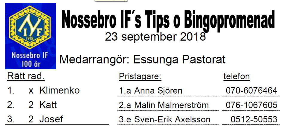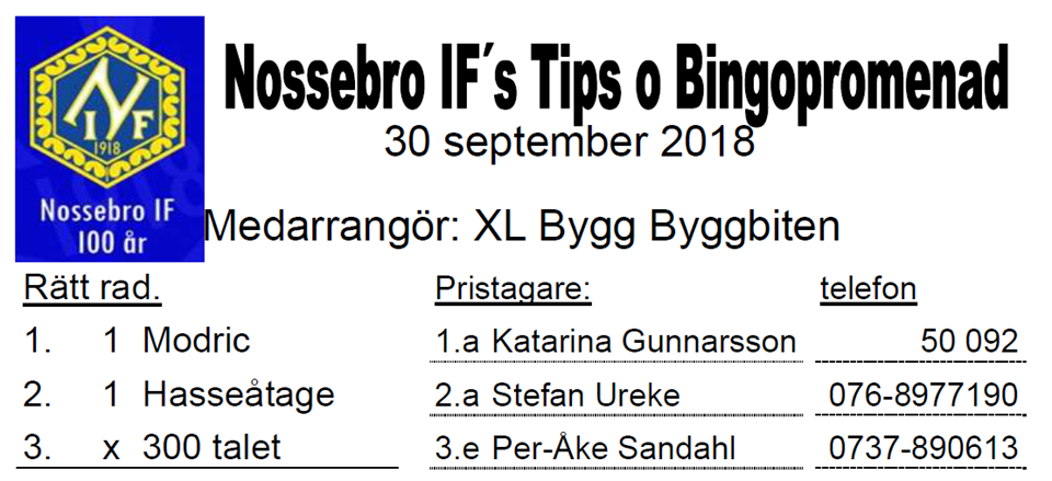 51 personer gick söndagens Tipspromenad i samarbete med XL Bygg Byggbiten. Se rätta raden och vinnarna här Nossebro IF 30 sep 2018 0kommentarer