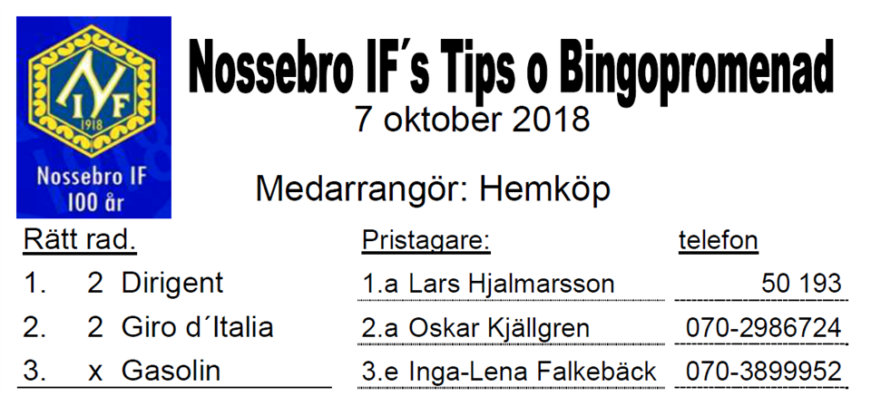 72 personer gick söndagens Tipspromenad i samarbete med Hemköp. Se rätta raden och vinnarna här Nossebro IF 7 okt 2018 0kommentarer