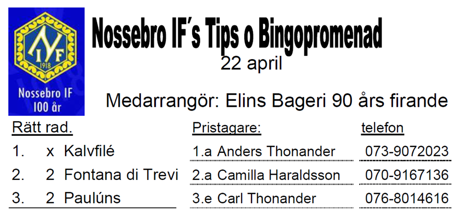 77 personer gick söndagens Tips- & Bingopromenad i det fina vårvädret. Medarrangör var 90-årsjubilerande Elins Bageri & Konditori. Se rätta raden och vinnarna här. Nossebro IF 22 apr 2018 0kommentarer