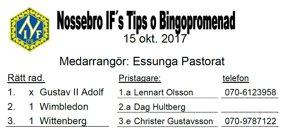 82 personer gick söndagens Tips- & Bingopromenad i samarbete med Essunga Pastorat. Se rätt rad och vinnare här. Nossebro IF 15 okt 2017 0kommentarer