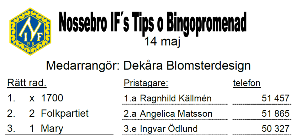37 personer gick söndagens Tips- & Bingopromenad i samarbete med Dekåra Blomsterdesign. Se rätta raden och vinnarna här.