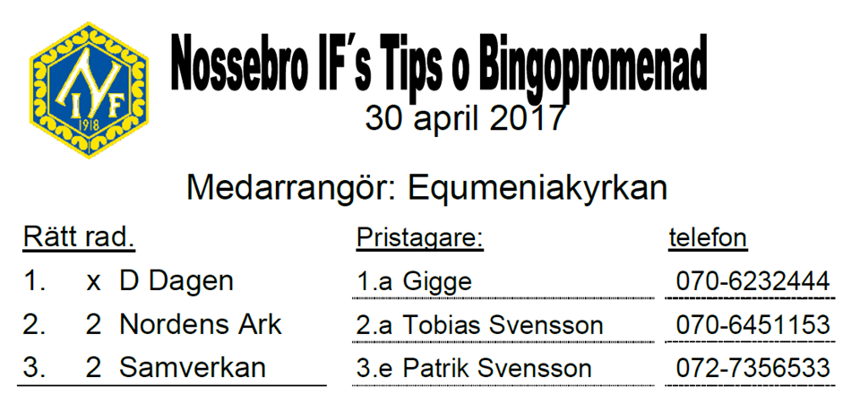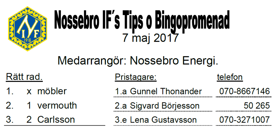 38 personer gick söndagens Tips- & Bingopromenad i sarmarbete med Nossebro Energi. Se rätta raden och vinnarna här.