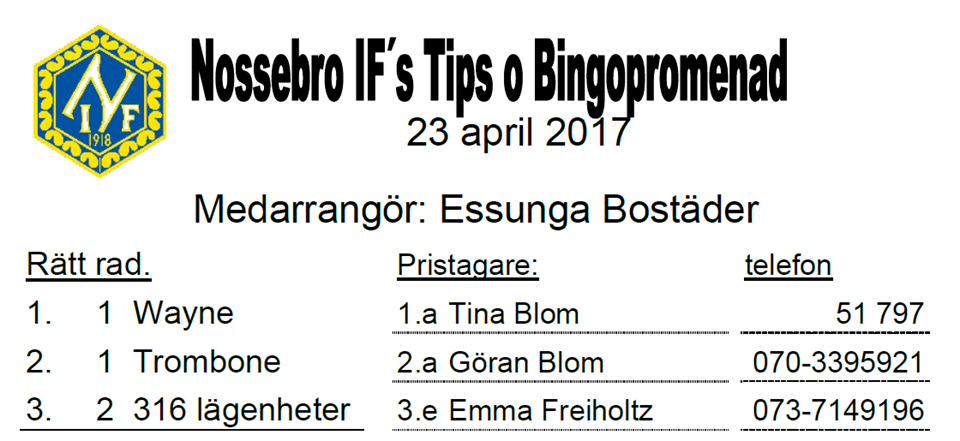 103 personer gick söndagens Tips- & Bingopromenad i samarnete med Essunga Bostäder. Se rätta raden och vinnarna här.