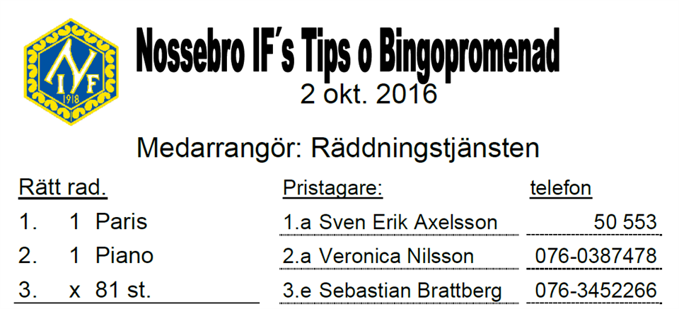 90 personer gick söndagens Tipspromenad i samarbete med Räddningstjänsten Nossebro. Se rätta raden och vinnarna här. Nossebro IF 2 okt 2016 0kommentarer