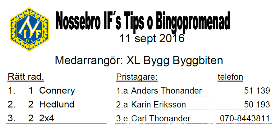70 personer gick söndagens Tips o Bingopromenad i samarbete med XL Bygg Byggbiten. Se rätta raden och vinnarna här. Nossebro IF 11 sep 2016 0kommentarer