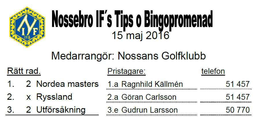 25 personer gick söndagens Tips- & Bingopromenad i samarbete med Nossans GK. Se rätt rad och vinnare här. Nossebro IF 15 maj 2016 0kommentarer