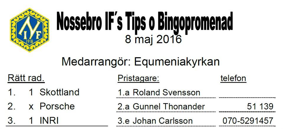 63 personer gick söndagens Tips- & Bingopromenad i samarbete med Equmeniakyrkan. Se rätta raden ovh vinnarna här. Nossebro IF 8 maj 2016 0kommentarer