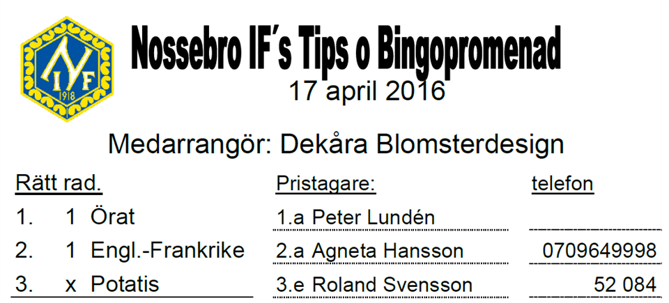 49 personer gick söndagens Tips- & Bingopromenad i samarbete med Dekåra Blomsterdesign. Se rätta raden och vinnarna här. Nossebro IF 17 apr 2016 0kommentarer