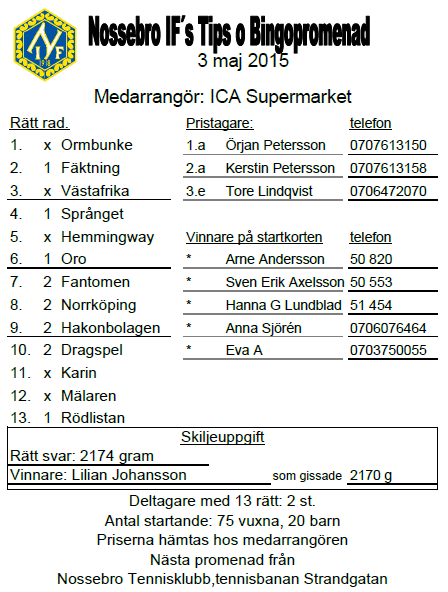 95 personer gick söndagens Tips- & Bingopromenad i samarbete med ICA Supermarket. Se rätt rad och vinnare här!
