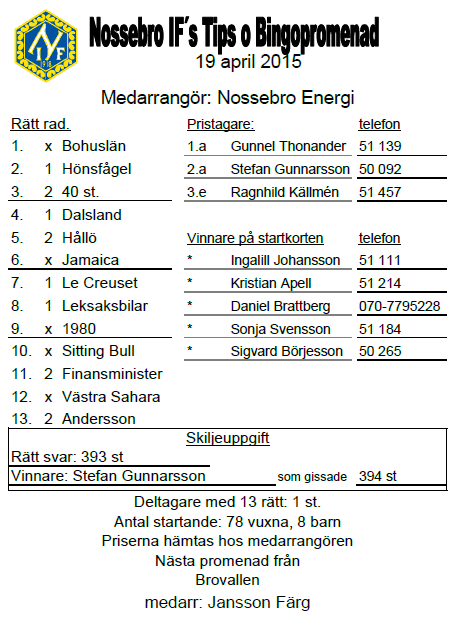 86 personer gick söndagens Tips- & Bingopromenad i samarbete med Nossebro Energi. Se rätt rad och vinnarna här.